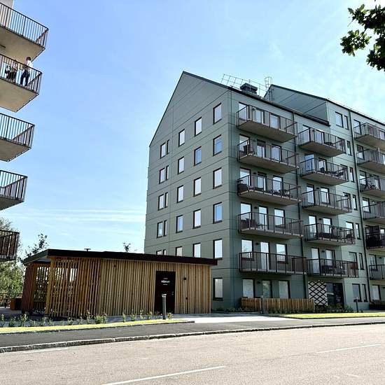 Här erbjuds en fin, välplanerad och nyproducerad hyresrätt med balkong i väst på 9 kvm. På planritningen och bilderna kan du se i viket hus samt vart i huset lägenheten är belägen. Filmen som visas för lägenheten är en film från en exakt likadan lägenhet men ett plan nedanför denna. Köket har luckor och lådor i stilrent vitt och är utrustad med diskmaskin, häll, moderna vitvaror, stänkskydd i vitt kakel och plats för mikrovågsugn. Badrummet har klinker i svart, kakel i vitt och badrumsskåp med belysning. Här finns även tvättmaskin och tor...
