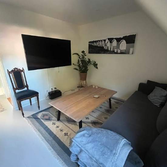 Det finns två badrum i bostaden. På övervåningen finns tre rum, varav ett med en ny bäddsoffa (140 cm) och en stor TV. I det större rummet finns en dubbelsäng, stora garderober samt längre in i rummet flera hyllor och gott om förvaringsutrymme för kläder och annat. Det mindre rummet har en 140 cm-säng och en byrå. På nedervåningen finns ett badrum med tvättmaskin och torktumlare. Köket är toppmodernt och fullt utrustat. Den öppna planlösningen bjuder in till gemenskap, med ett stort matbord för åtta personer samt en mysig hörna med soffa ...