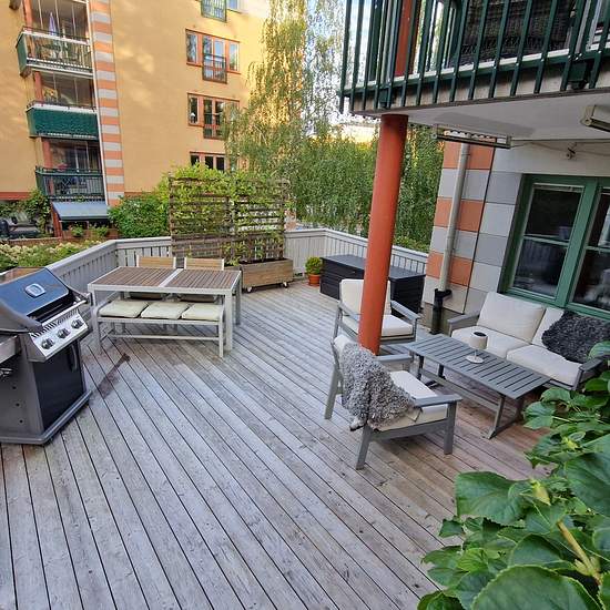 Mycket välplanerad fyra med radhuskänsla i bästa läge. Till lägenheten hör en stor terrass i skyddat läge samt parkering direkt utanför porten. Kök: renoverat och med alla bekvämligheter, vitvaror från Bosch och Miele Sovrum: två barnrum samt ett större sovrum med garderobsvägg samt förråd Badrum: ny inredning 2021, dusch och tvättmaskin från Miele. Hall: rikligt med avhängningsmöjligheter samt tillgång till hallförråd Terrass: 35 m² fullt möblerad med matgrupp, sittgrupp, förvaringslåda och gasolgrill från Napoleon. Från terrassen har...
