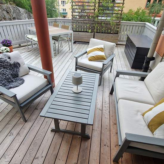 Mycket välplanerad fyra med radhuskänsla i bästa läge. Till lägenheten hör en stor terrass i skyddat läge samt parkering direkt utanför porten. Kök: renoverat och med alla bekvämligheter, vitvaror från Bosch och Miele Sovrum: två barnrum samt ett större sovrum med garderobsvägg samt förråd Badrum: ny inredning 2021, dusch och tvättmaskin från Miele. Hall: rikligt med avhängningsmöjligheter samt tillgång till hallförråd Terrass: 35 m² fullt möblerad med matgrupp, sittgrupp, förvaringslåda och gasolgrill från Napoleon. Från terrassen har...