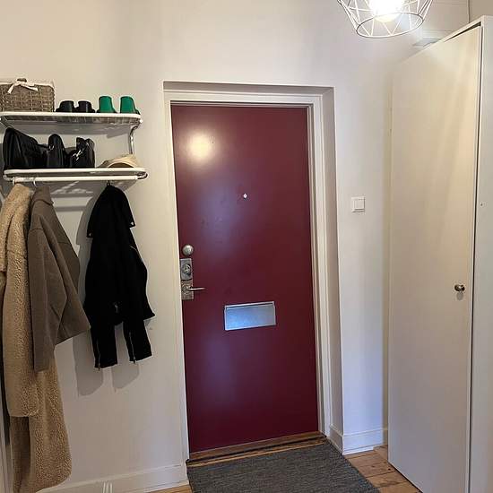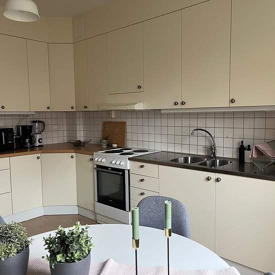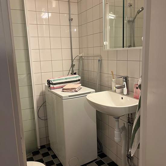 Charmig och rymlig etta med stort kök. Trägolv i vardagsrummet. Helkaklat badrum med plats för tvättmaskin, (45 cm).