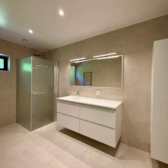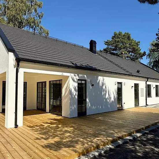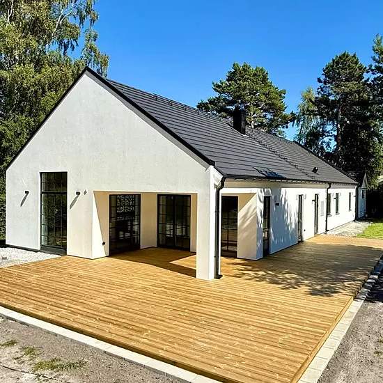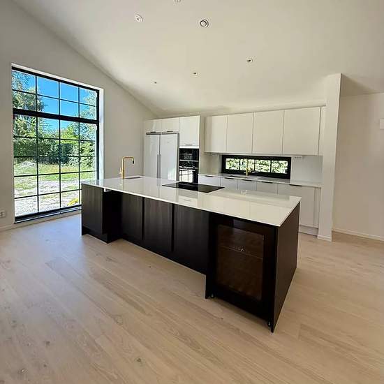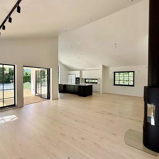 Beskrivning En helt nybyggd enplansvilla med fantastisk rymd i vardagsrum och kök. Året runt boende. Stor insynsskyddad tomt med fina träd och stort trädäck i västerläge. Lugnt område med ringa biltrafik. 5 min cykel till sandstrand. Nära skola och förskola. Separat förråd i trädgård samt vindsförråd i huset. Trädgården kommer att bli klar i augusti.