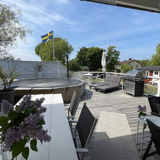 UTHYRES TILL MAJ 2026 Välkommen att hyra vår naturnära tvåplansvilla i Gräddö, 15 minuter med bil från Norrtälje. Villan på 140 kvm har stort kök, matsal, vardagsrum, TV-rum, tre sovrum, badrum med dusch, golvvärme och tvättmaskin, en gästtoalett samt en stor inglasad veranda som kan nyttjas sent in på hösten. Soliga dagar kan även uteterassen användas. Området är lugnt och stillsamt och på endast 5 minuters gångavstånd har du en välsorterad ICA, pizzeria och småbåtshamn. Hyrs ut möblerad och fullt utrustad med alla husgeråd, möbler, TV etc....