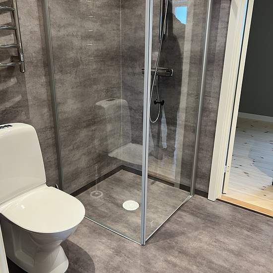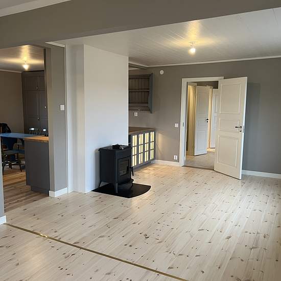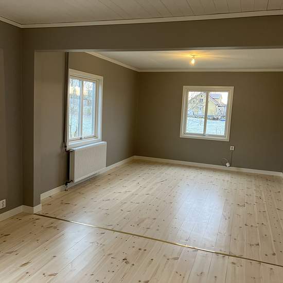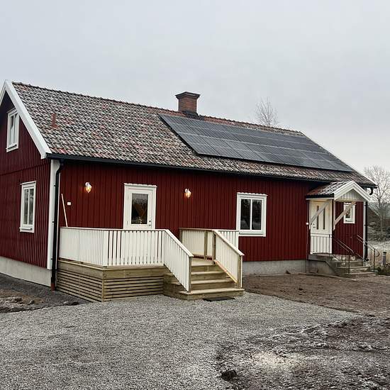 Nyrenoverad villa på landet Hela byggnaden är genomgripande renoverad och tillbyggd 2025. Bottenvåning innehållande entré med klädvårdsrum/hall utrustat med egen tvättmaskin och torktumlare. Toalett med dusch. Rymligt kök med matplats och grå köksinredning. Köket utrustat med induktionshäll, spisfläkt, inbyggd varmluftsugn och mikrovågsugn, diskmaskin samt kyl och frys. Stort vardagsrum och hall med WC och dusch. Från klädvårdsrum finns trapp upp till övre plan. I anslutning till klädvårdsrum finns en uteplats med trädäck. Övre plan innehå...