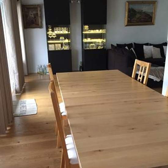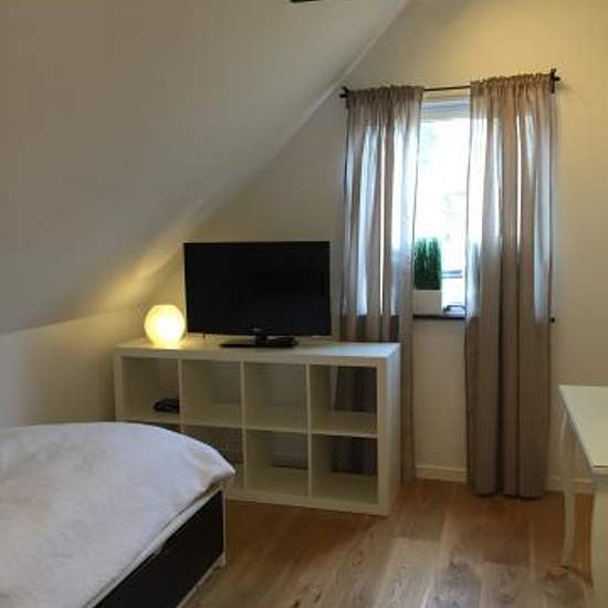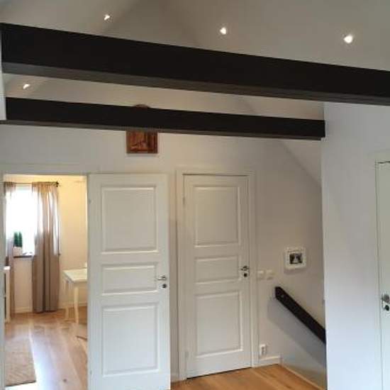 Huset är en två plans villa som renoverades 2013. På nedre plan finns ett stort badrum med tvättmaskin och torktumlare samt dusch och toalett. Sovrummet på nedre plan används idag som kontor. Entrén, köket, matplatsen och vardagsrummet har en öppen planyta med stora fönster mot uteplatsen. En trappa upp finns tre sovrum, varav ett har tillgång till balkong, ett mindre vardagsrum, toalett med badkar och garderobsutrymme.
