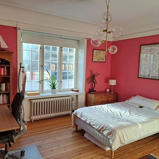 Ett ljust och rymligt rum uthyres i stor, charmig lägenhet med högt i tak och vackra trägolv. Perfekt för dig som söker ett bekvämt och centralt boende. Du delar badrum (med dusch, toalett och badkar) och fullt utrustat kök med min 22-årige son som studerar på KTH samt en annan inneboende. Tillgång till tvättstuga i källaren och snabbt fiberbredband. El, värme och vatten ingår i hyran. Rosa rummet är 20 m², 140-säng, skrivbord, klädförvaring, kakelugn och eget handfat. Bra kommunikationer – bussar utanför dörren, 5 min till Vasaparken och 1...
