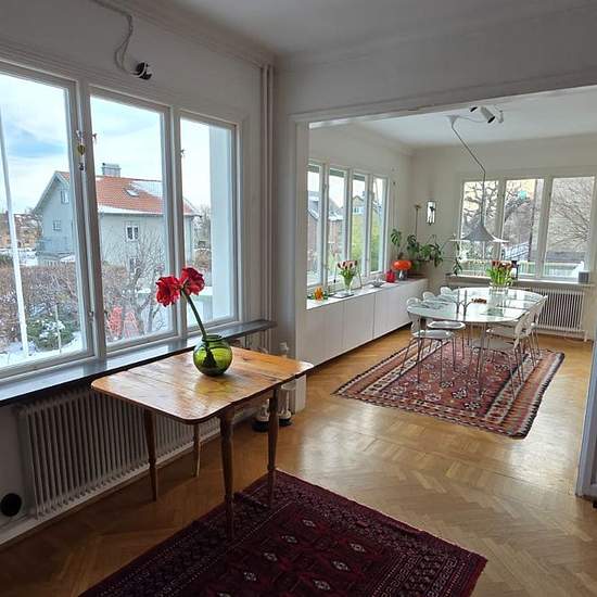 Välskött och mysig funkisvilla från 1935 på Väster/ i sjukhusbacken uthyres ett år från slutet av juli. Originalstilen är bevarad men huset är successivt renoverat och är i gott skick med två moderna badrum, 3 toaletter, 5-6 sovrum och stora sällskapsytor. Rummen är fördelade över tre våningar med tre sovrum högst upp, där ligger också ett badrum med dusch och toalett samt en liten TV-hörna. På mellanplan ligger kök i öppen planlösning till matrummet och med utgång till en solig terass. Här finns också vardagsrum med öppen spis, separat TV-...