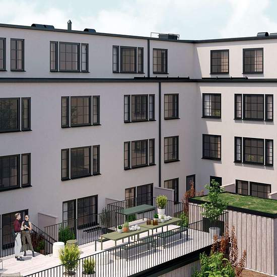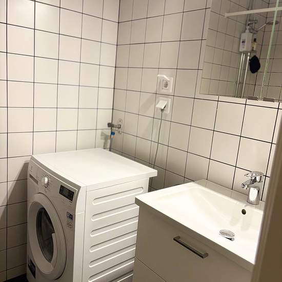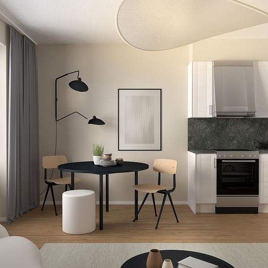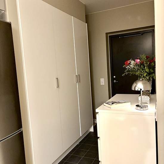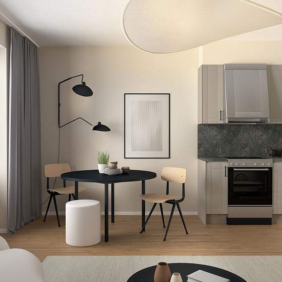 A well-planned 1-room-and-kitchen apartment (1RoK) on the 1st of 4 floors with an open-plan layout. The apartment measures 26 m² and has a patio facing the inner courtyard. Kitchen from Vedum with grey fronts. Fully tiled bathroom with underfloor heating. Tiled floor in the hallway. Single-strip parquet and walls in a warm light beige tone. Open fiber optic network in the building.