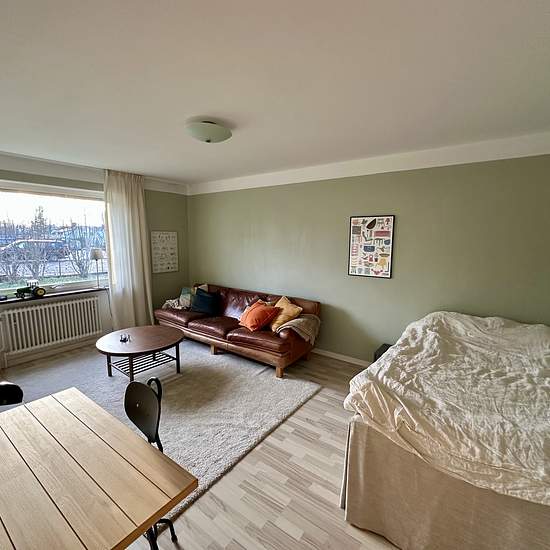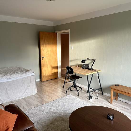 Hi! I am renting out my apartment in Älmhult because I got a job in another town. The apartment is a 37 sqm studio with a separate kitchen. The apartment is rented furnished. The kitchen has recently been repainted and renovated with a raised work surface for more ergonomic use. The kitchen has space for a dining area. In the main room there is room for a bed, desk, and sofa plus space for a TV without any problem. The bathroom has a toilet and a shower. The hallway has space for a wardrobe and a coat rack. Walking distance: 10 minute...