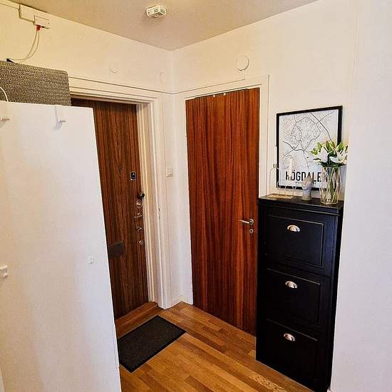 Apartment for rent in Örby, Älvsjö. The apartment: Studio of 34 sqm. The apartment is located on the 3rd floor without an elevator. Small hallway, cozy kitchen and a larger living room/bedroom with a built-in desk and storage. Newly renovated bathroom. Included: Washing machine (there is also a laundry room in the basement) Kitchen table/chairs Fridge/freezer Microwave Sofa Bed Storage room Wardrobe/closet Private parking The area: Örby is about 25 minutes from the city center by public transport. 10 minutes' walk to Älvsjö Station. 1 min...