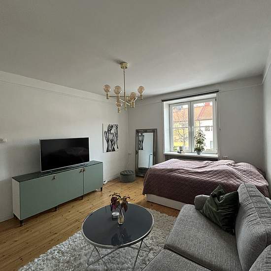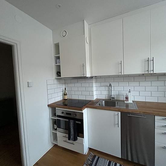 Välkommen till lugna Örby, här har du verkligen nära till allt. Hemköp ligger tvärs över gatan bredvid en djuraffär samt ett gym. Flertalet restauranger finns över gatan och runt om i området finns ännu fler olika typer av matställen och matvagnar som kommer på besök. Flertalet bussar går precis utanför huset och Älvsjö station når man enklast via en kort 10 minuterspromenad genom ett trevligt villaområde. Tack vare det stora fönstret är köket ljust och trevligt även gråa dagar. Köket är snyggt uppdaterat med vita luckor, vitt kakel, och e...