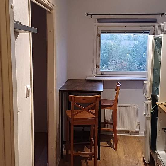 Hej. Vi hyr ut en uthyrningsdel i vår lägenhet med egen ingång. Den är då helt avskärmad från vår lägenhet. Den är på 25 kvm med kokvrå (litet kök) med kyl/frys och liten toa/dusch, två garderober, Internet och el ingår. Lägenheten är omöblerad, förutom högt köksbord med stolar. Vi kommer att måla och fräscha upp lite innan nya hyresgästen flyttar in. Den ligger i gamla Östberga, härifrån tar man buss 10 min till gulmarsplan, 10 min till Älvsjö, 15 min till Liljeholmen. Här i gamla Östberga finns det ett litet Coop, ett bageri, sushi re...