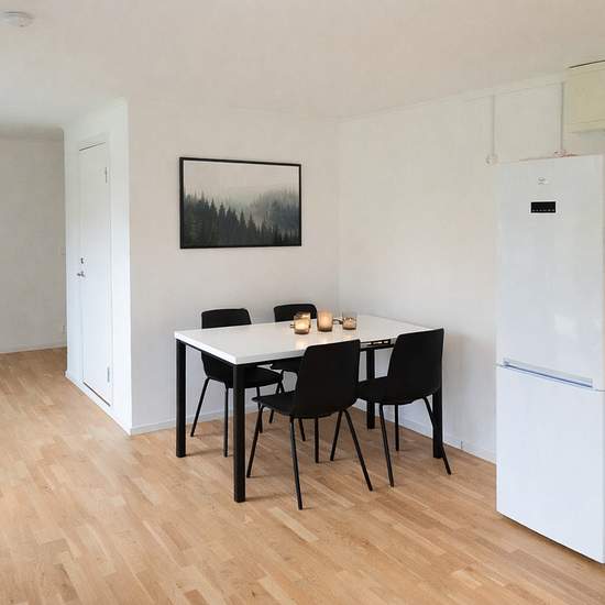 Welcome to a bright and well-planned one-and-a-half-room apartment with a modern and pleasant feel. The apartment offers an open and inviting layout between the kitchen and living room, with plenty of space for both a dining table and a seating area. The large windows provide generous natural light and create an airy, harmonious atmosphere. The kitchen is stylish and functional with a fridge and freezer, stove with oven, extractor fan, and good work surfaces and storage. The light cabinet doors combined with the dark tiles give a modern an...