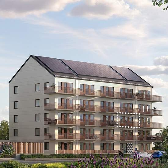 Here is a nice, well-planned newly built rental apartment with a southwest-facing balcony of 7 m². In the photos and floor plan you can see which building and where in the building the apartment is located. The video shown for the apartment is from an identical apartment with the same layout, but in another building and possibly on a different floor. The kitchen has sleek white doors and drawers and is equipped with a hob, modern appliances, a white tiled splashback and space for a microwave. The bathroom has black floor tiles, white wall t...