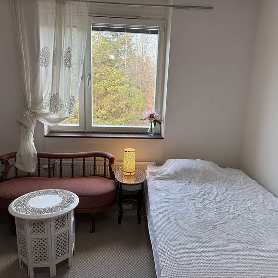 Room for rent: Large, bright and furnished room in Hägstra with a beautiful view over the forest. Only a 9-minute walk to the train station, close to Älvsjöbadet and with bus 143 to Älvsjö station around the corner. The room is fully equipped with a bed, wardrobe, bedside table, TV, small fridge and desk. Rent includes electricity, broadband and access to the laundry room. Perfect for someone looking for a quiet and comfortable place to live with proximity to nature and transport links. Preferably to a woman who works or studies. Service fe...