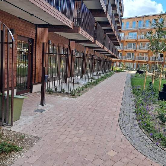 Köken är välutrustade med vita eleganta luckor från HTH. På golvet ligger en vacker ekparkett. Väggar, tak och lister är vitmålade. Badrummen ar helkaklade med stora vita blanka plattor på väggarna och beige klinker på golvet. De är även utrustade med duschvägg i glas, spegelskåp med belysning, kromad handdukstork samt krokar. Badrummen är också förberedda for tvättmaskin och torktumlare. Fastigheten ar rökfri och har en stor grön innergård med gemensam odling, sittyta med pergola Bara några minuters promenad bort ligger Rågsveds tunne...