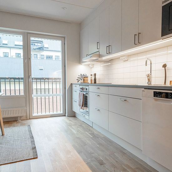 Välkommen till Kvarteret Kasernen 1 i Regementsstaden, Borås! Här hyr du en fin, ljus och nyproducerad hyresrätt av Hökerum Fastigheter med uteplats i syd på ca 16 kvm. På bilderna och planritningen kan du se i viket hus samt vart i huset lägenheten är belägen. Takhöjden är 2,5 meter i lägenheten och golven är genomgående tre-stavs ekparkett i vardagsrum, kök och sovrum, kompletterad med klinkergolv i omedelbar anslutning till entrédörren i hallen. Alla väggar är målade i vitt. Köket från Marbodal har luckor och lådor i stilrent vitt och ...
