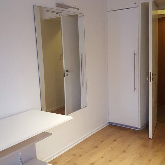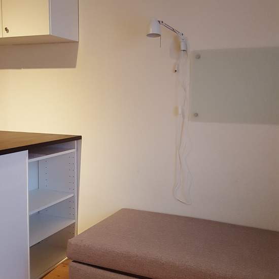 The apartment is located in a quiet area, just a few minutes' walk from the town center and the transport hub. It has a well-thought-out layout. The main room is flexible and contains a kitchenette, a dining area/workspace and a sleeping area. The kitchen has plenty of storage. Included are a hotplate and a sink, and a small refrigerator with a freezer compartment. It is a well-managed housing association with all amenities; the apartment also comes with a heated garage. Service fee for tenant: 249