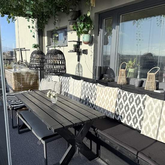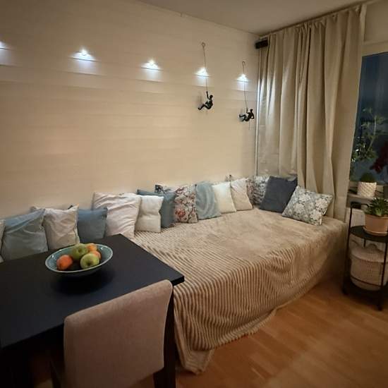 On the 8th floor is this studio apartment. Fully furnished and equipped. The apartment has sweeping views and is private, not overlooked. The icing on the cake is access to part of a fantastic south-facing roof terrace. The terrace belonging to the apartment is approximately 20 m², half of which is a lovely enclosed sunroom. Metro directly outside the door and the possibility of a garage space in the building. Private entrance from the communal entrance and a private bathroom with a shower.