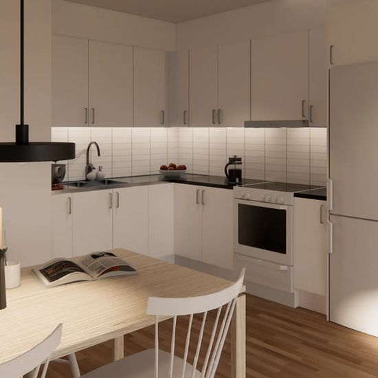 Well-planned one-room apartment with kitchen and sightlines from the hall to the kitchen and living area. The kitchen has an open floor plan with living/sleeping area and dining space. Energy-efficient appliances in the kitchen, and the bathroom has a combined washer/dryer. • Bright, beautiful kitchens from HTH • Energy-efficient appliances • The bathroom has a shower and a combined washer/dryer • Almost all apartments have a balcony or patio • Durable laminate floors with oak pattern throughout the apartment • Tiled floors in the hall • Li...