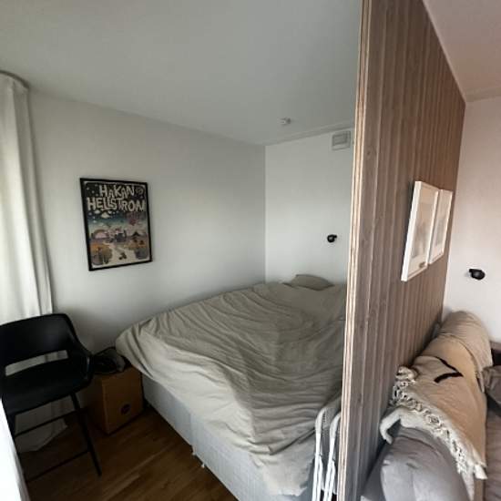 Ny välplanerad 1:a med sov alkov. Inglasad balkong som vätter mot bunkeberget. Kombinationsmaskin för tvätt. Möblerad med 160cm säng, tv-bänk, soffa, garderob, balkongsoffa, och stolar till det tillbyggda bordet. Allt ingår i hyran. el internet värme vatten osv. Bilderna är tagna innan utflytt från lägenhet.