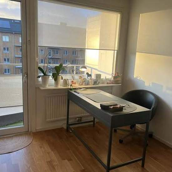 A spacious vacant bedroom (23 sqm+) with balcony is available from January 2026 for renting out at least for 6 months. Rent is around 7500 sek and fully furnished. You'll have your own closet, own couch, office desk, 140 bed, and balcony. Kitchen and bathroom are newly renovated and also very equipped. Location: Pilegarden Bus to Chalmers 14 mins Looking for 1 organized person.