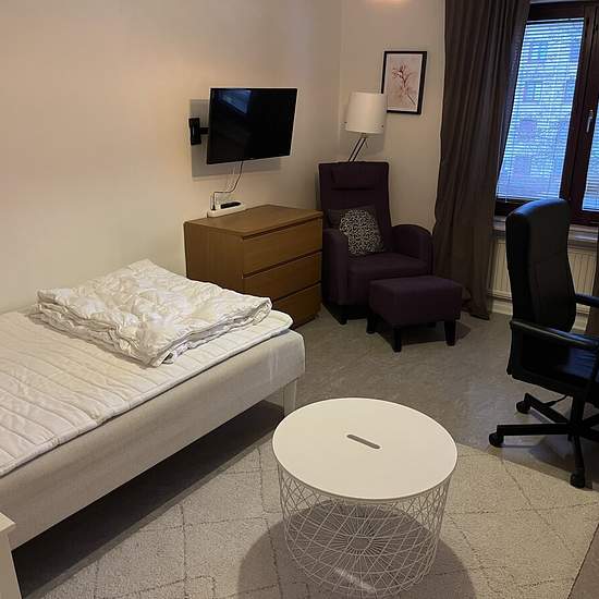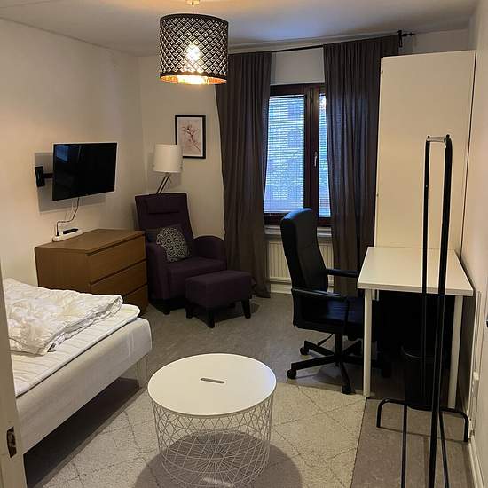 Room in an apartment in Olskroken for rent to a girl (no pets), with a private toilet. Renovated and fresh apartment; the room is furnished. Bus stop on the road outside, good transport connections. Service fee for tenant: 222
