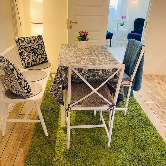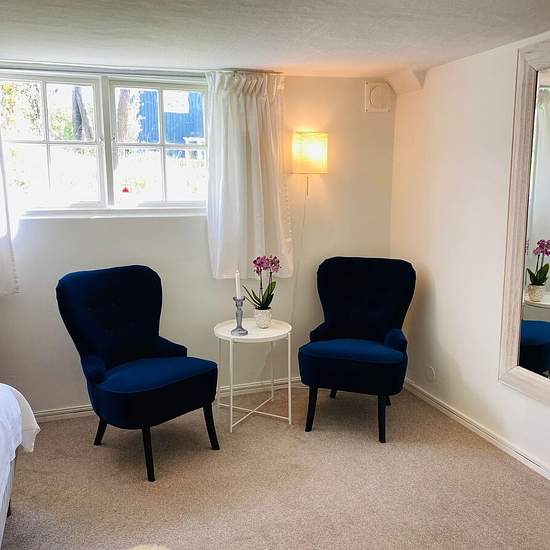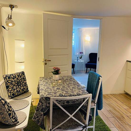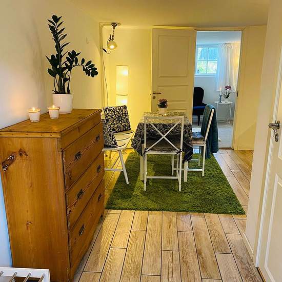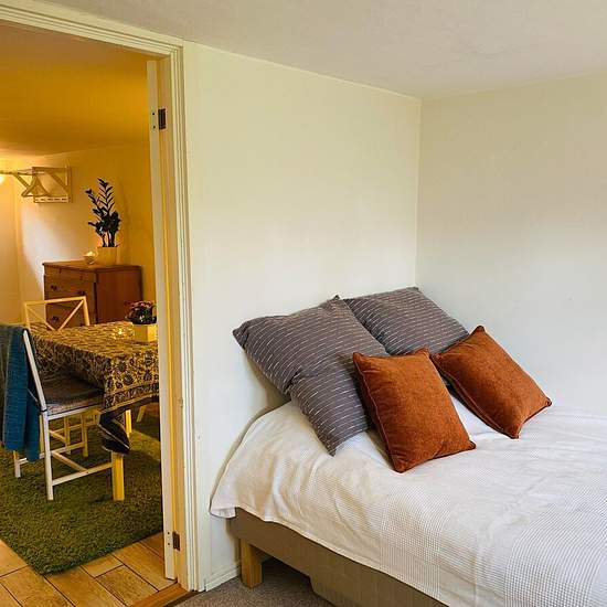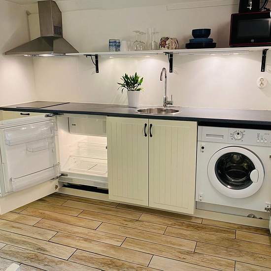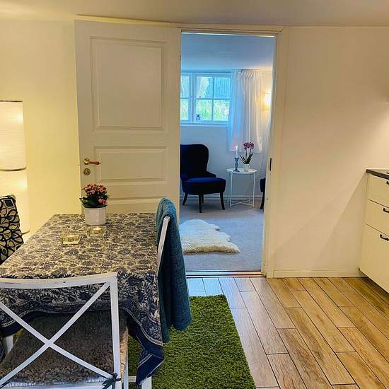 Hello! We are now looking for a new tenant for a self-contained apartment in our house. Description: Bright and cozy 28 sqm apartment. 1 room and kitchen. The apartment is fully furnished and equipped (120 cm bed, seating area with armchairs, dining area with a kitchen bench, table and chairs, storage furniture). Bathroom with underfloor heating, shower, toilet and washbasin. Kitchen equipped with a stove (but no oven), extractor fan, small fridge with freezer compartment and washing machine. The apartment is located on the lower ground/bas...