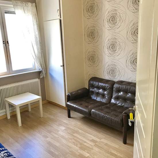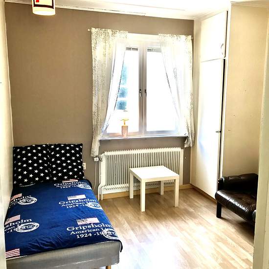 Image shows room 6 on the ground floor. Rooms are available in various sizes (approx. 8–16 m2). The house has three floors, with rooms and a toilet on each. Located only 50 meters from Haparanda center and 10 meters to Svefi. IKEA is 850 meters away. Bus stop 75 meters away. Shared newly renovated bath, toilet and kitchen. Washing and drying facilities in the basement. Toilet on each floor. Code lock on the front door for extra security. Electricity, water, heating and Wi‑Fi are included in the rent. Note: The price is per person/night. Serv...