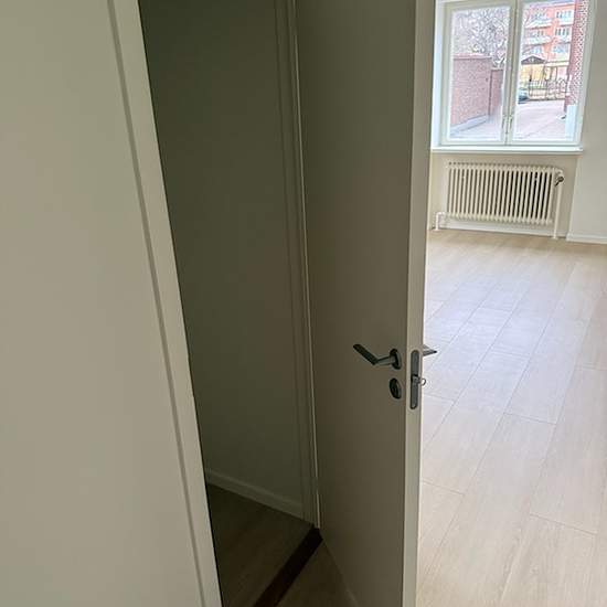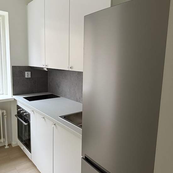 Completely renovated and very nice apartment in a quiet location facing the inner courtyard. The apartment has all modern conveniences such as a dishwasher, kitchen extractor fan, new appliances, and good storage options. Fully tiled bathroom with tiled floor and electric underfloor heating as well as an electric towel warmer. Broadband outlet for your own subscription for TV and Wi‑Fi. Possibility to rent a parking space or garage. Newly renovated laundry room with new machines. Newly renovated storage room belonging to the apartment. ...