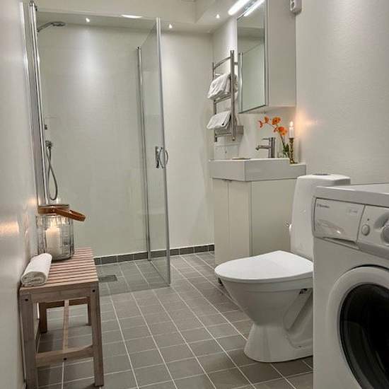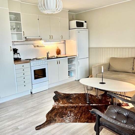 Bright and fresh apartment with an open floor plan in central Hemavan. 50 meters to the illuminated ski trail and close to the bus stop. The apartment has underfloor heating in the bathroom and hallway, a renovated bathroom with a towel warmer and a combined washer/dryer. Two outdoor patios that offer morning sun as well as afternoon and evening sun. Parking outside the apartment with the option of an engine heater space. A storage room adjacent to the entrance for storing, for example, ski equipment. Snowmobile garage and parking are includ...
