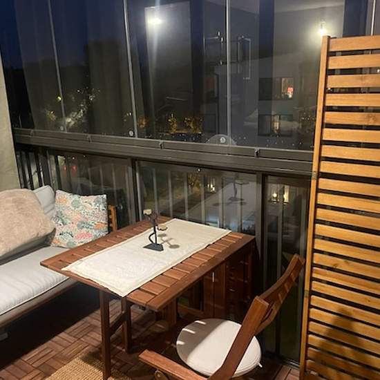 Partially furnished. There is a 120 cm wide bed as well as balcony furniture. The balcony is glazed and has infrared heating; it has an open aspect and no overlooking. 7-10 minute walk to the centre/commuter rail. Service fee for tenant: 559