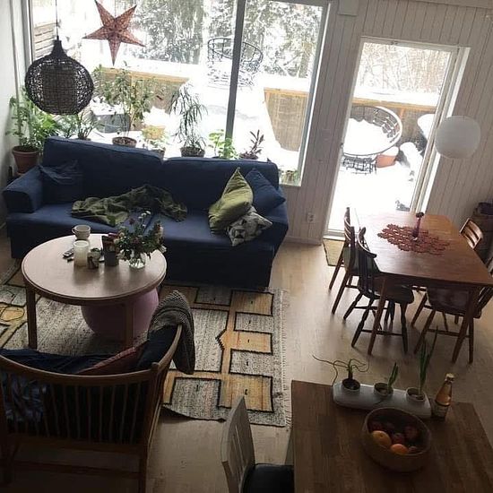 Nature-close mini collective in Knivsta (Uppsala<~>Stockholm) has a vacant room Available only over the summer also welcome, bathing jetty 2 minutes from the door 1.3 km to the train station where the SL commuter train and other trains go, Uppsala 10 min and Stockholm city 45 min or about half an hour by train which is faster than SL. Bus stop a couple of minutes away. The residence we call jungle-cottage is a five-room apartment on two floors in a newly built wooden house, part of the housing cooperative Walloxen. Bedroom of 7 sqm with st...