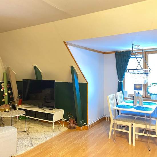 Hel mysig vindslägenhet med snedtak och synliga åsar. Ny spis och fläkt. Storstuga med kök, separat sovrum. Delvis kaklat bad.
