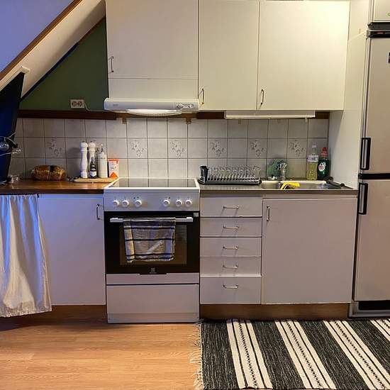 Hel mysig vindslägenhet med snedtak och synliga åsar. Ny spis och fläkt. Storstuga med kök, separat sovrum. Delvis kaklat bad.