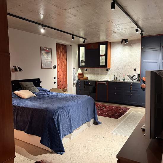 Apartment in the basement of a villa in Professorstan. Full ceiling height and windows facing the garden. Private entrance. Bathroom with shower and combined washer/dryer. The apartment is rented furnished. Service fee for tenant: 470