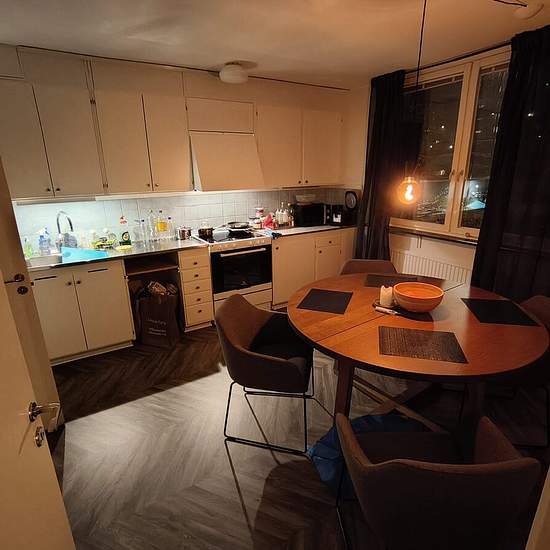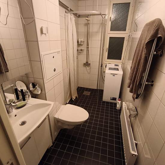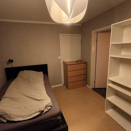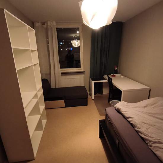 It is one of the bedrooms in my two-bedroom apartment, where I have the other bedroom. The shared areas are the kitchen, hallway and toilet. There is also a storage room in the basement, an outdoor bicycle room, and a shared laundry room for the whole building.