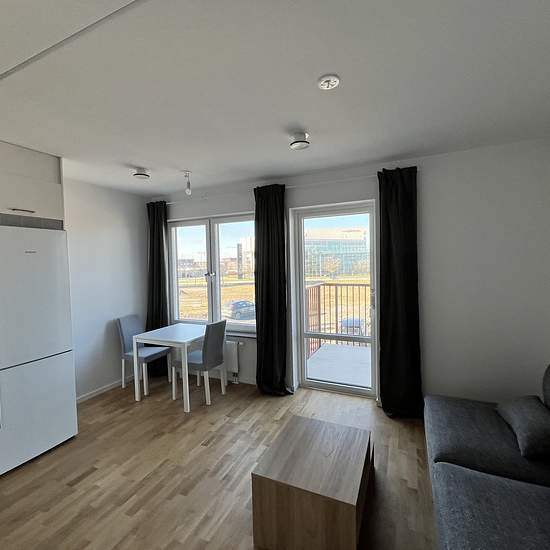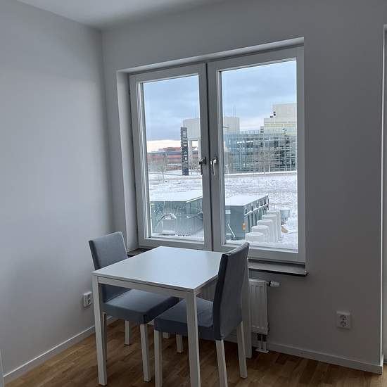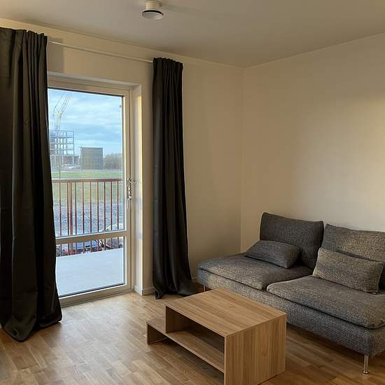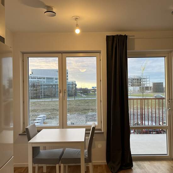 Welcome to this newly built apartment with a smart layout and a west-facing balcony. It comes fully furnished with a small dining table, sofa, and a bed (105 cm) in a sleeping alcove. Fully equipped kitchen, fully tiled bathroom with a combined washer and dryer. The building has an elevator as well as a rooftop. The apartment is newly built (December 2023) and is located in Brunnshög, near Axis, Eriksson and Ideon. It is 200 m from Solbjer station, which goes directly to Lund C and ESS, and 200 m from Hemköp. It takes about 15 minutes to c...