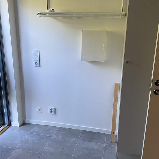Apartment About the apartment There is now a well-planned 35 sqm apartment with 1 room and a kitchenette on the ground floor with its own patio. The apartment is bright with white-painted walls and light tiled flooring with underfloor heating. The kitchen has an open plan to the room and is equipped with white cabinet doors, a black countertop, an electric hob, an extractor hood and a fridge with a small freezer compartment. The bathroom has white wall tiles, grey floor tiles and a combined washer/dryer. (No dishwasher.) Individual metering...