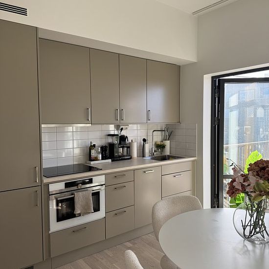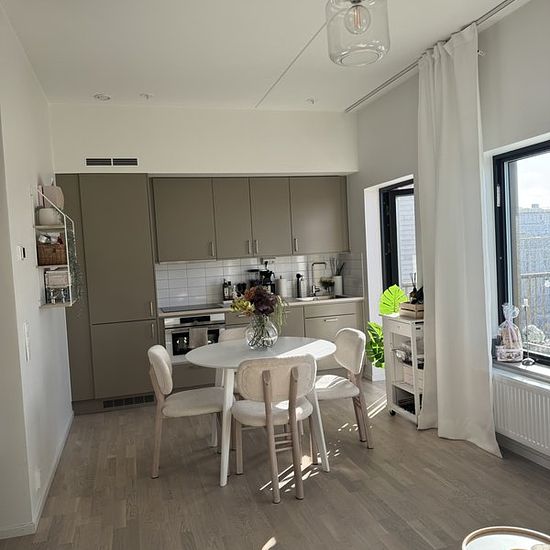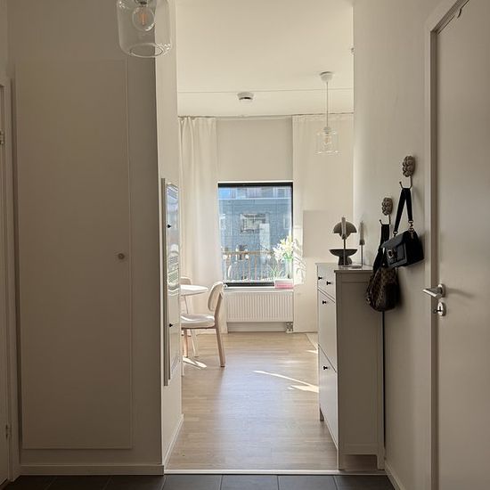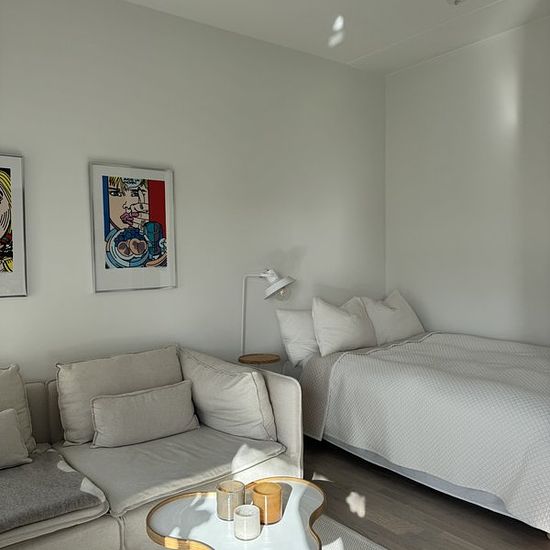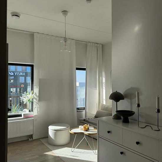 Almost brand new 1-room apartment of 34 sqm. Everything in new condition and fine materials. 6th floor with a large balcony facing south/west. Living room, kitchen, and sleeping area in the same room. Bright with large windows and 2.90 m ceiling height. Large bathroom with shower and combined washer/dryer. Large wardrobe with stylish and practical interior. Elevator, security door, and intercom connected to the mobile phone. Internet, water, and heating included. Electricity cost to be discussed. Insurance required. The apartment is...