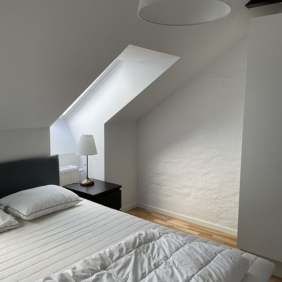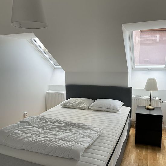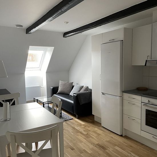 En trevlig möblerad vindsvåning med synliga takbjälkar. Bra planlösning med ett litet separat sovrum Lägenheten är renoverad på senare år och är i mycket fint skick. Den är lämplig att hyra som företagslägenhet eller att ha som övernattningslägenhet. Ordinarie hyra är 10 100 kronor per månad men de två första åren hyrs lägenheten ut med en hyresrabatt om 2739 kronor per månad därefter tas en ny diskussion om hyresrabatten.