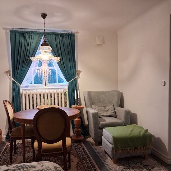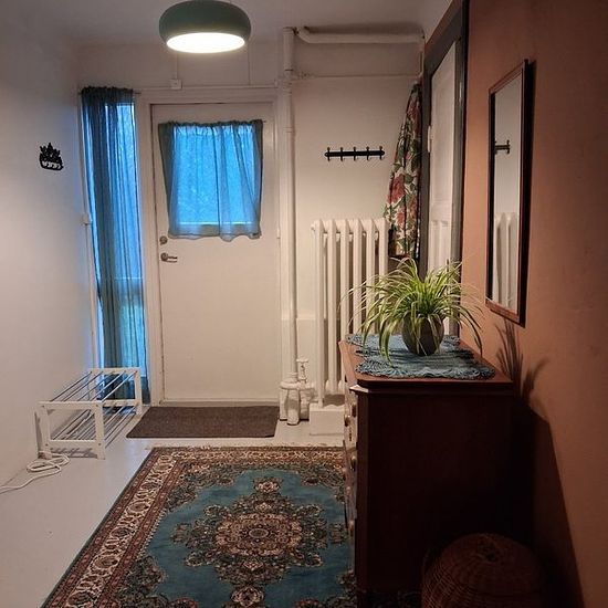 Spacious studio apartment for rent in Blombacka near Molkom. Separate entrance, living room, bathroom, and kitchen. Newly renovated in 1950s style. Very cozy apartment. Furnished or unfurnished. You can choose yourself. Private garden. 5 minutes walk to the nearest bus stop. It takes about 20 minutes to drive to Karlstad city center and just a few minutes to Ängsbacka. Close to nature, forest, and lake. Short-term rental from Nov-May. Service fee for tenant: 297