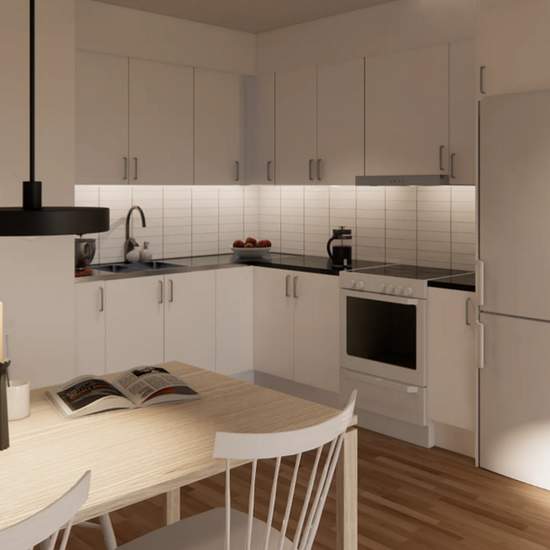 Well-planned one-room apartment with a clear line of sight from the entrance to the kitchen/living area. The kitchen is open-plan with the living room and dining area. Bathroom with shower and combined washer/dryer. Bright, attractive apartment with white-painted walls and ceiling. The floors are tiled in the hallway and have vinyl flooring in the bathroom; otherwise the apartment has laminate flooring throughout. The kitchen has white cabinetry and energy-efficient appliances. Located in the leafy, nature-close Alsberg — Nässjö’s newest r...