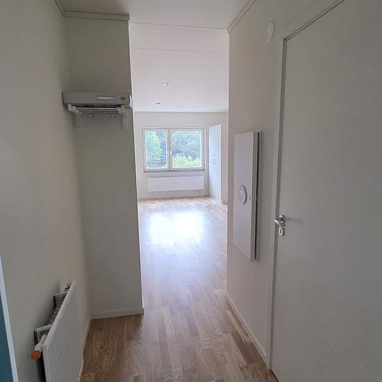 Smart and stylish studio — newly built with high standards Welcome to a space-efficient studio with a smart layout and modern material choices – perfect for those who want to live compactly and comfortably. The open layout creates an airy impression where the kitchen and living room are naturally connected. The sleek Marbodal kitchen in a warm gray tone is equipped with a hob, oven, and combined fridge/freezer – and also has an integrated washer-dryer, conveniently placed in the kitchen area. The bathroom is fully tiled with white tiles a...
