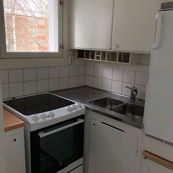 Hot and cold water included Heating included Digital TV, basic package included (Telia) Household electricity extra. Internet extra, open fiber. Cold storage, bicycle storage, stroller room available. Parking available in the area, separate agreement. There is no elevator in the building. Balcony available. Kitchen: Wall, painted/wallpaper Floor, linoleum/plastic mat Kitchen cabinets, white doors Shared fridge and freezer. Stove plates/hob Bathroom: Wall, tiles Floor: wet room mat Shower area/bathtub Room: Wall: painted/wa...