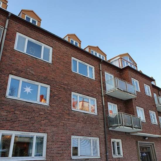 The property was built in 1945 and is made of brick and concrete. The property underwent a major renovation in 1988. There is a laundry room in the basement. Hot and cold water and heating are included in the rent. Electricity requires a separate subscription. The property is connected to the fiber network; subscriptions can be taken out with any provider. A storage room is included with each apartment. Some balconies have views of Storsjön and Frösön.