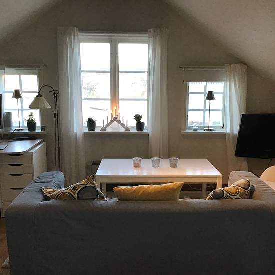 Detached house on a residential plot with lake view. One large room but divided with a sleeping area. A kitchen area with a breakfast bar and everything. The floor area is 50 sqm with sloping ceilings. Everything is in very good condition. We have a bike shed and are very close to Sollentuna center and buses and commuter trains. Located in a very quiet area. You can walk across the street and skate on a cleared skating track in winter. Everyone who has come to see it has wanted to live here and said yes to the home. A laundry room is in a bu...