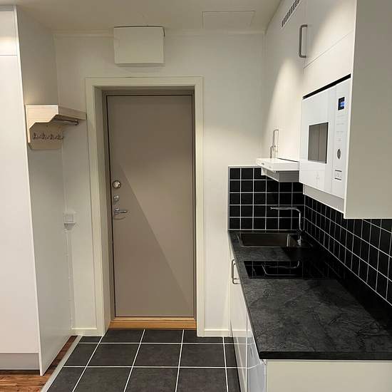 Here you can rent a small 19 sqm apartment at Poppelgatan 4 B in Motala. It is best suited for overnight stays. The apartment was built in 2023. It has one room with a kitchenette. The kitchen is equipped with a hob, extractor fan, microwave with grill function and a refrigerator with a freezer compartment. You live very centrally, close to both the canal and the city center. It takes about ten minutes to walk to the station. You are close to public transport, restaurants, shops and green spaces.