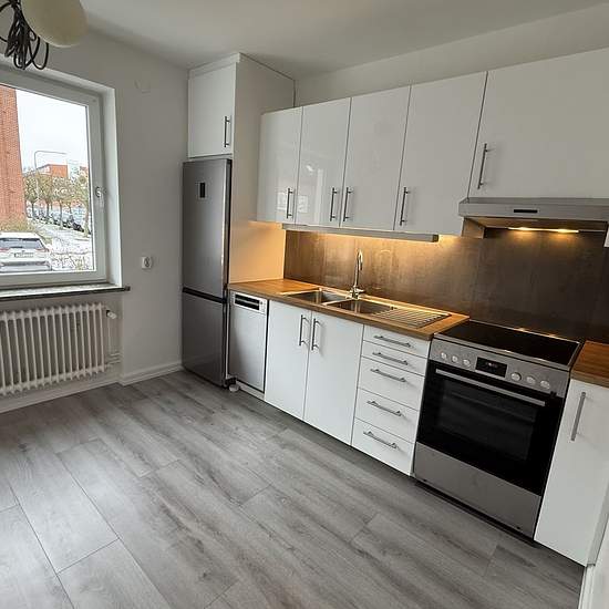 Rent 6919 kr - no agency fees Description Centrally located in Trelleborg, this apartment is on the 1st floor (half a flight up, 5 steps), with windows facing west. Everything in the apartment has been newly renovated. All appliances, etc. are new. The bathroom has underfloor heating and a towel warmer. The kitchen has a dishwasher. Security door. Apartment storage in the basement. Washing machines are available in the basement. Available immediately. Very quiet building. Are you interested in renting this apartment? Provide a description...