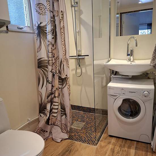 A charming Attefall house with a sleeping loft. Private screened patio, quiet area, close to forest with lovely trails. There is a mattress on the loft, a sofa bed in the living room and a small table with two chairs. Basic kitchenware is provided. Electricity, water, gas (gas stove), garbage collection and Wi-Fi are included. 4 minutes to the bus which takes 5 minutes to the commuter train station, then about 25 minutes to Stockholm City. Trains run every 15 minutes during daytime. No pets and no smoking due to allergies. Service fee for te...